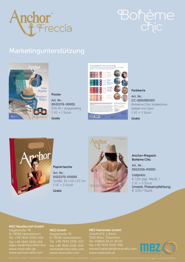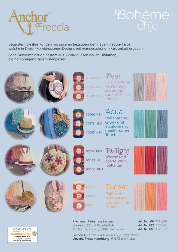 Preis: 59,65 EUR zzgl. gesetzl. MwSt. zzgl. Versand Artikelnr.: A28BOHF-09061 Lagerbestand: 0Begeistern Sie Ihre Kunden mit bezaubernden neuen Freccia-Farben, welche in Dreier_kombinationen Designs mit wunderschönem Farbverlauf ergeben. Thekensortiment gibt es gefüllt in jeweils den Stärken 06,12,16,mit 30 Knäuelen UVP 4,25€ 50g in 9 Farben(3 Farben mit 4+6 Farben mit 3)zzgl. 15 Magazine Bohème Chic UVP 3,50€ + 1 Poster gratis.